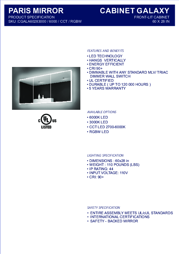 Delivering approximately 12760 lumens with a high CRI of 90+, the Galaxy cabinet ensures bright, accurate lighting perfect for grooming and makeup application. Its dimmable feature, compatible with standard MLV/TRIAC dimmer switches, allows you to adjust the brightness to suit any mood or time of day.