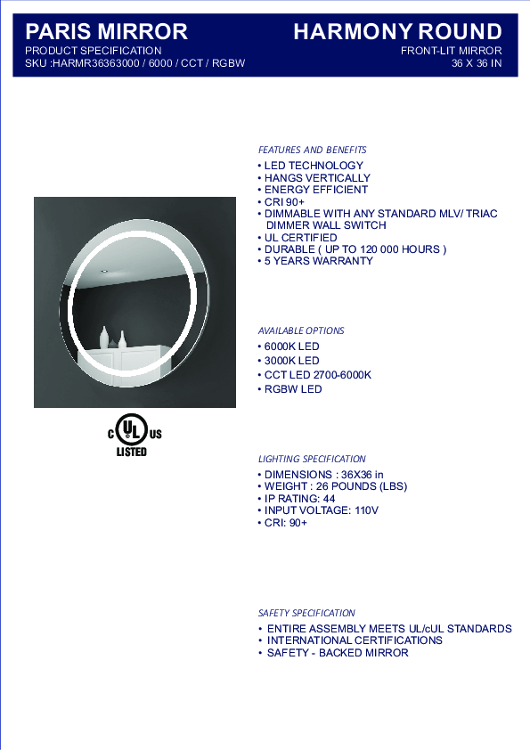 Engineered for durability and ease, this mirror is fully dimmable via standard wall dimmers and is UL/cUL certified for reliable performance.
