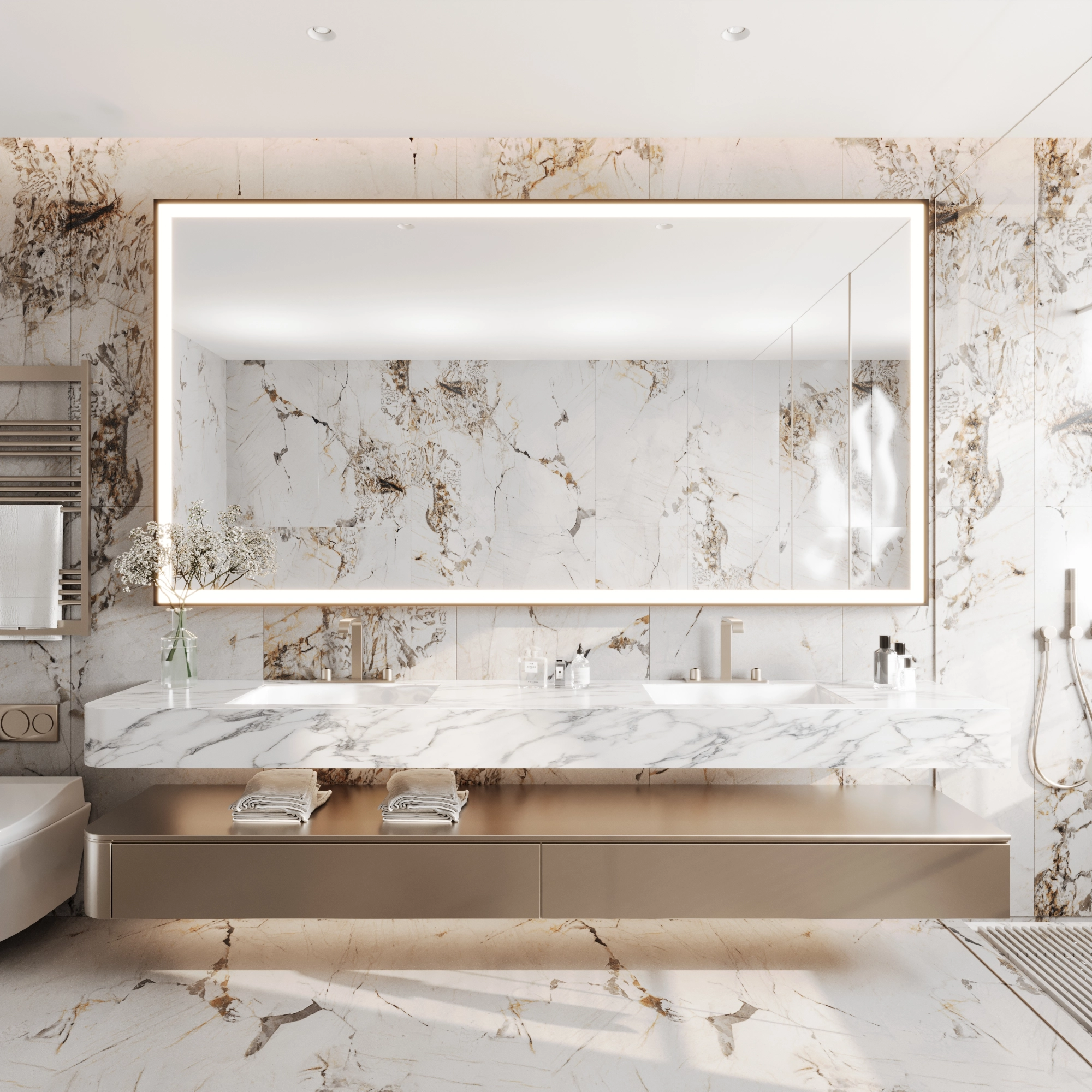 Add bold sophistication to your space with the Chic 100 x 45 LED Vanity Mirror in Gold. Its clean rectangular lines and rich frame create a striking modern look, perfect for bathrooms, powder rooms, or dressing areas.