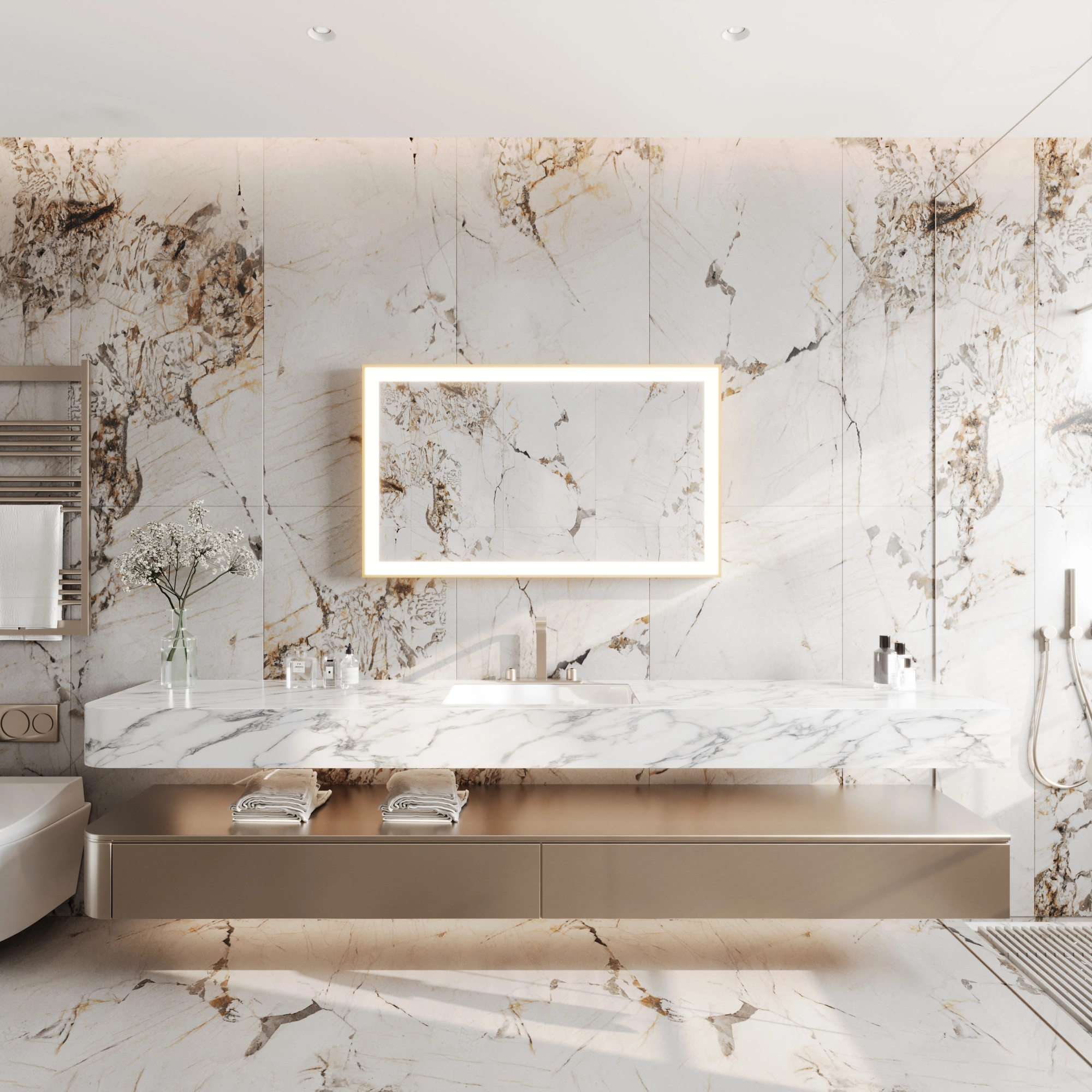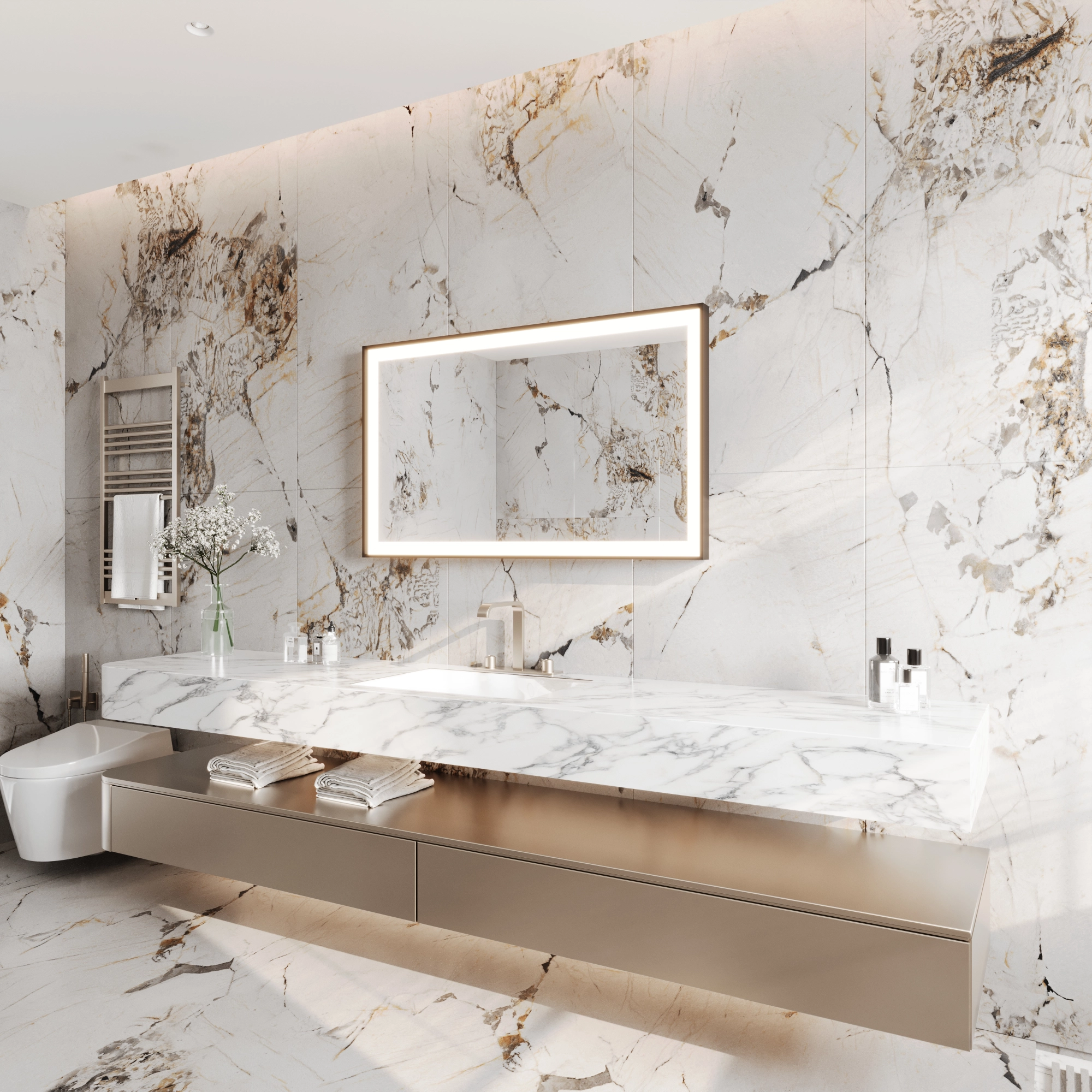 Featuring powerful LED lighting at approximately 6840 lumens and a high CRI of 90+, this mirror delivers bright, true-to-color illumination ideal for grooming and makeup. It's fully dimmable with any standard MLV or TRIAC wall switch, allowing you to adjust brightness to suit any mood or time of day.